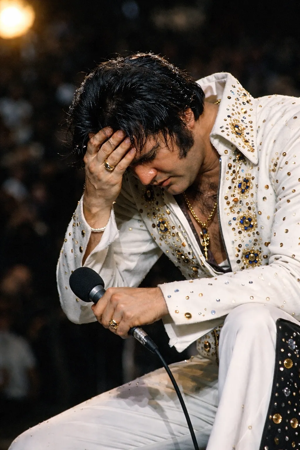 The rhinestones on his jumpsuit still sparkled, but they couldn’t hide the weight in his eyes. The spotlight that once crowned him now felt like an interrogation. Every second of silence stretched painfully long.